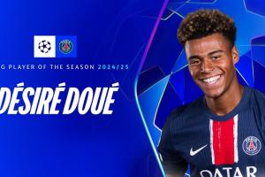 决赛2射1传!官方:19岁巴黎边锋杜埃当选欧冠赛季最佳年轻球员