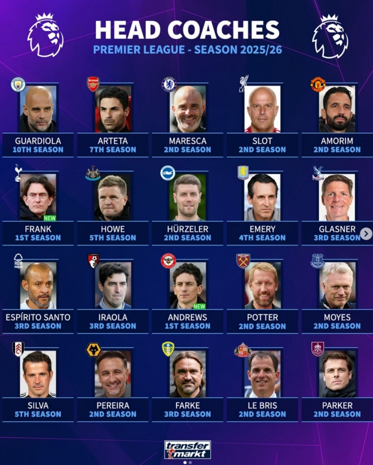 8月18日讯 德转盘点了英超20支球队主帅执教时间情况,其中瓜迪奥拉执教曼城第10个赛季最长,具体如下(数字为执教赛季):